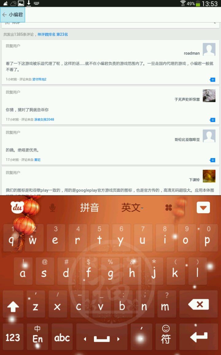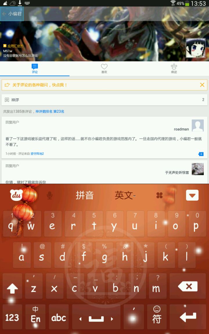 产品君!新反馈!为什么应用汇有时候在评论界面中点击某个人的头像,想查看他的详细信息,但是输入法没有消失?并且一点击输入法上边的字母,右上角的虚拟退回按钮就呈现出蓝色的方框?求修复!下面的两张图是我看小编君的详细信息是出现的。这是我的输入法的问题还是汇汇的问题?我用的是百度输入法pad版。
