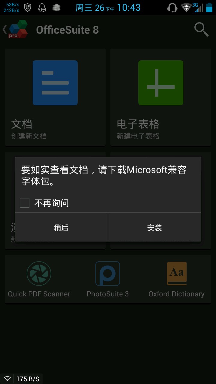 2014-11-27 [有回复] 中兴U956#搜索反馈#OfficeSuite Font Package,不知道是不是叫这个,反正中文名应该是Microsoft字体兼容包,officesuite的插件,汇汇未收录啊啊啊啊啊