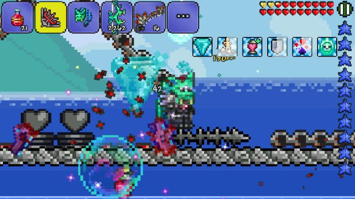 就这样,爱心雕像。钉刺。吸血鬼刀。强效生命药剂。慢慢打。就把猪鲨打死了.