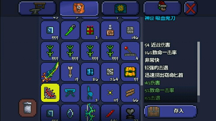 首先需要准备装备:金属尖刺(二十几个);吸血刀(附魔带伤害加成);饰品:黑腰带;星晨披风;近战徽章;免击退盾;上界之石;(不用带翅膀,附魔全部伤害+*4);防具神圣套以上(五十防以上);吸血刀伤害五十以上(吸血刀伤害越高吸血越快)