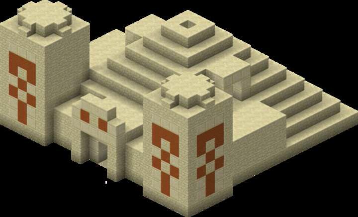 其外形似金字塔,从正门进入后会发现里面什么都没有,但是地板上有用黏土块儿组成的图案,正中心是蓝色的,现在,把它敲掉,会看到有一个暗室在地下,这时候请不要直接下去,不然会踩到压力板触发TNT,所以,大家可以沿着侧面竖直挖下去。下去后大家就可以获取四个箱子里的东西了,当然,包括那九个TNT。