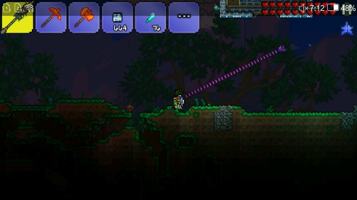 众所周知,泰拉前期有一个非常重要的道具:钩抓。技术稍好一点的人有它根本就不会摔死,还能爬各种墙,主要是由铁链和水虎鱼或骷髅身上掉的钩子做的。但是,楼主偶然发现,装备框里没有钩抓也能用它!有人问这有什么用,废话,这相当于多出一个格子,而且紧急情况下可以用嘛。如图,这是成果。只要背包里装了钩抓,然后手在屏幕上往你要抓的地方一滑,就可以了。那么这么简单为啥我要说这么多?废话,凑个字数混个上墙呗!