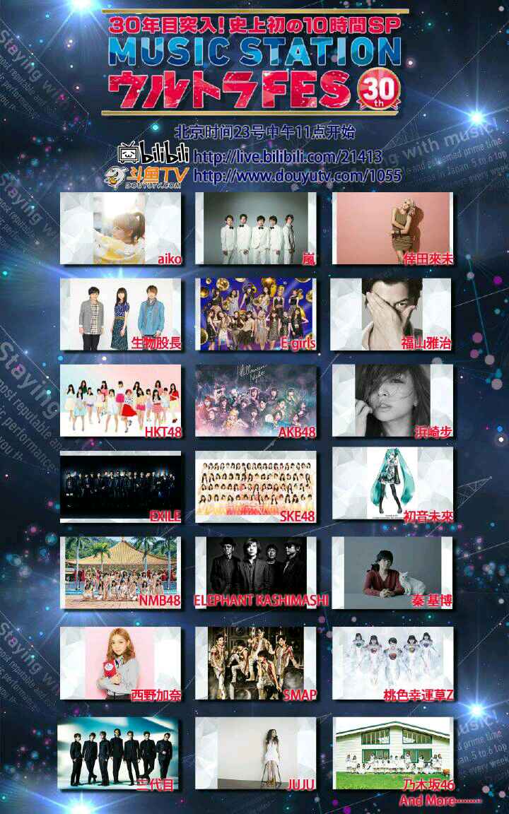 [cp]#Music Station# 30周年 10小时超长SP直播!!!北京时间23号中午11点开始一直直播到晚上9点哟!详细直播地址请看图片说明!共计61组当红明星演出!包括岚,SMAP,初音未来,桃草,AKB48,乃木板46,福山雅治等等等!!!!真的是受不了了!简直翘班也要看啊!直播地址看图片,直播时间23号中午11点![/cp]