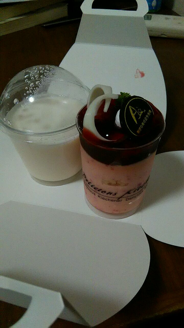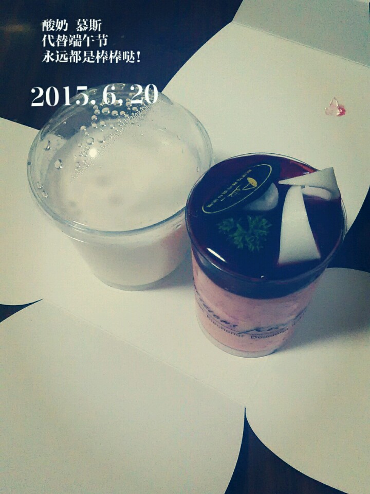 今天吃了一个慕斯和一杯酸奶吃着吃着啊!酸奶有股奶酪味。勉强和我姐吃了下去。剩下慕斯啦!我满心期待着上面的酱。结果一吃。我去!这味道酸啊!吃着吃着就把它给毁了!喜欢的话就点个赞吧不要端午节不给我个面子嘛