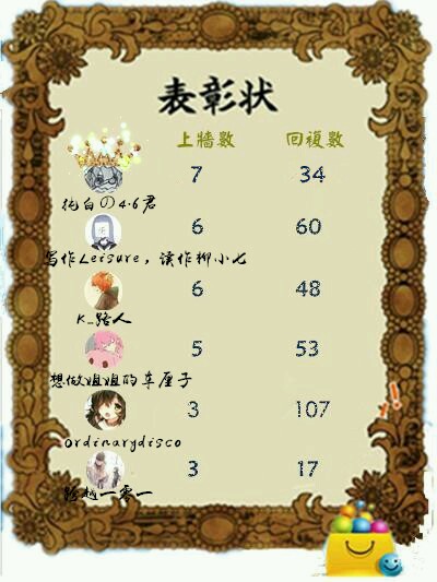本周神之晨曦也有3个上墙贴,但是回复数败给了101 ,所以遗憾落榜~不过没关系,下周一新的排行榜又会出现的!!!