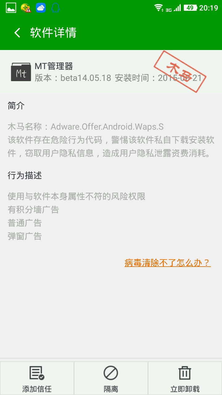 关于报毒问题调戏菌也发现了该应用当前版本的确存在恶意操作,请各位立即卸载并进行手机查杀修改您的所有在该手机上登陆过的账号(邮箱账号,银行账号,淘宝账号等等)的密码并暂时不要安装该应用等待官方处理。对比带来的不便请您谅解。