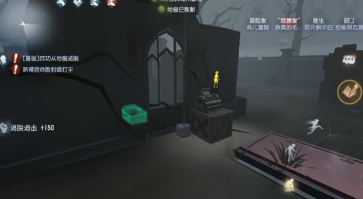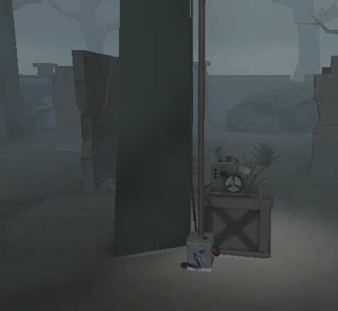 如图,钻进密码机旁边的柱子,缩小并且蹲下来,注意,由于缩小后有可能比柱子大一点,尽量少露马脚!修密码机最好站有柱子的一边,有心跳,如果监管者没有发现自己时,躲进去。