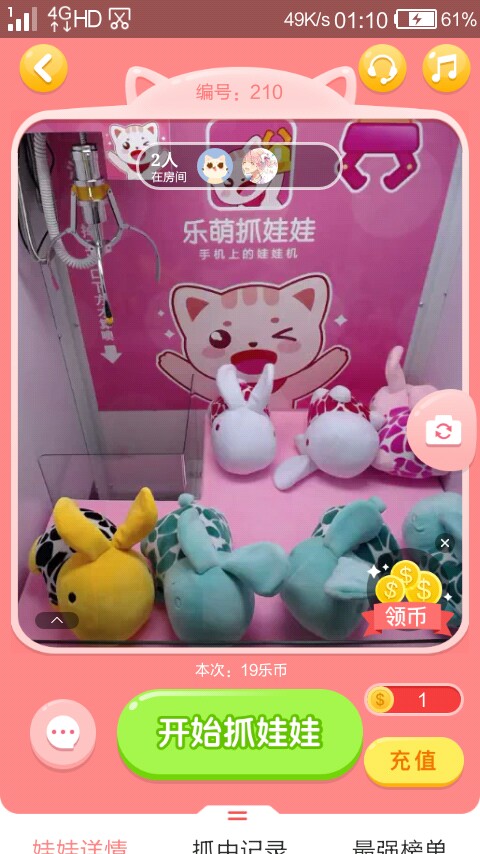 抓娃娃界面还有其他人的留言以及当前房间里有多少人在与你一起抓娃娃,往下翻还可以看到所抓娃娃的详细情况,比如大小规格颜色什么的!_(:з」∠)_
