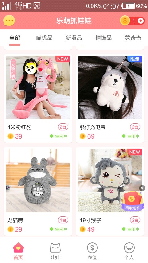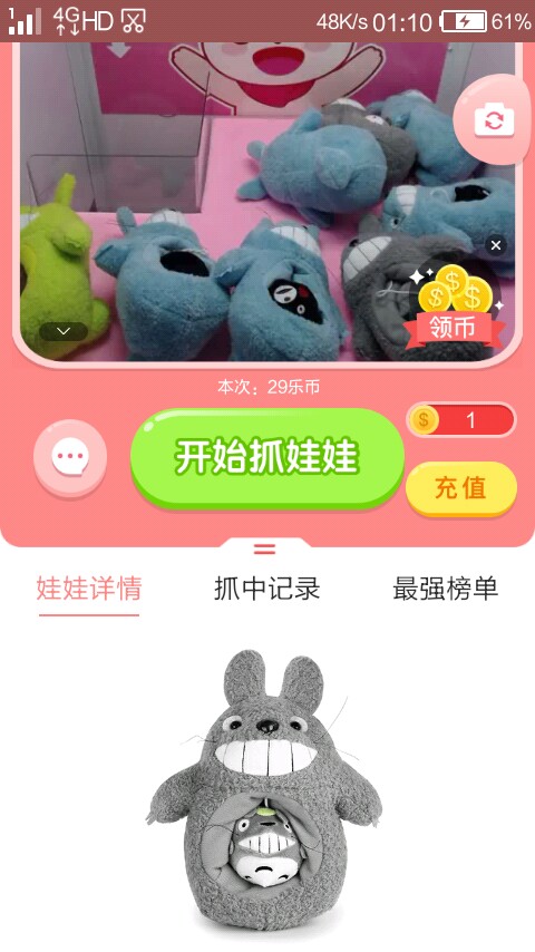 至于故事嘛!噗,然后就是抓娃娃啦!一开始送你39个币来抓,抓19的话可以抓两次!然后窝就看中了里面的一个龙猫|・ω・`),然而抓龙猫的话系统送窝的币只够抓一次……,思前想后的,窝还是去抓19的试试水吧……抓了两次毫无疑问……都失败了!要是这么容易就抓中了,那人家也不用开了!