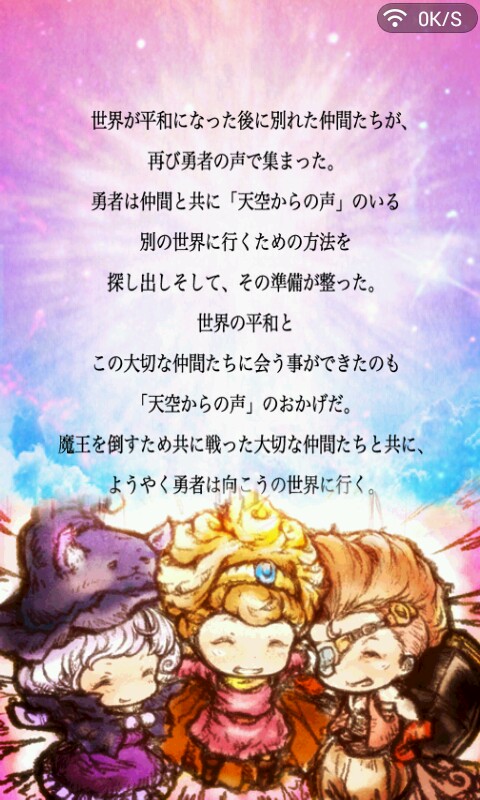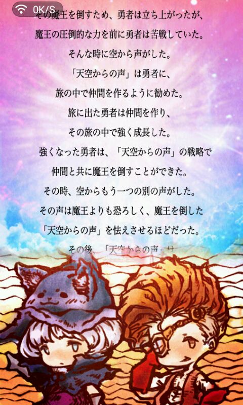 游戏开场讲述了从前有个魔王想要毁灭世界,勇者们出来制止魔王,与魔王进行了一番苦战……就在这时,天空传来了“天空之声”,魔王非常害怕这个声音,勇者们按照“天空之声”的战略行动,一起打败了魔王……而我们的勇者就是要寻找召唤“天空之声”的办法,重新与魔王进行绝对……嘛,游戏前景大概就是这个意思,好了,现在让我们一起帮勇者们收集召唤“天空之声”的东西,和勇者干掉魔王吧!