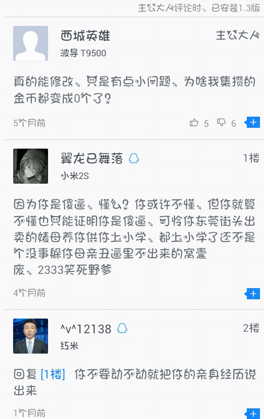 强烈赞同!给你个赞≡ω≡明天我上个图(截图有点问题第二天才显示)特别是glu金币修改器的评论w(゚Д゚)w对骂啊