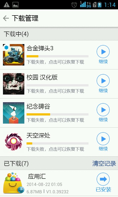 下着应用它就不下了,然后就成下载失败,说网络连接错误,但是我还刚才还可以更新应用汇。。。。。。。