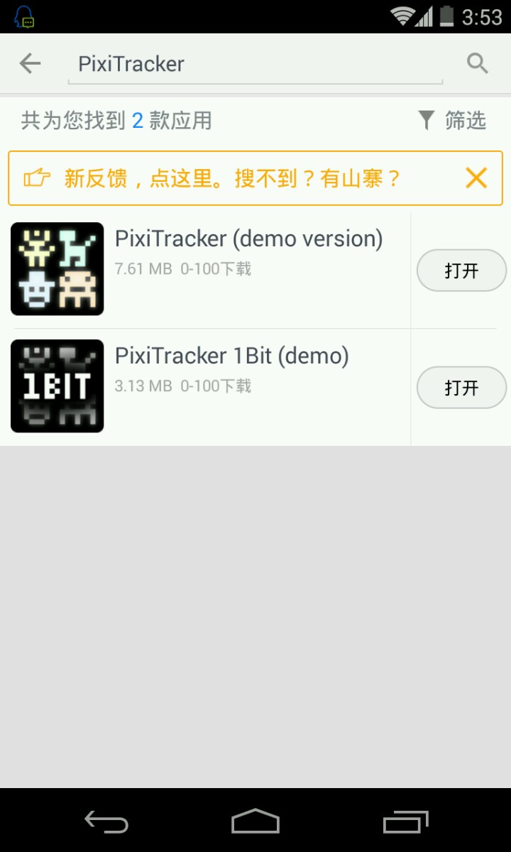 明白了 ”PixiTracker 1Bit“和”PixiTracker“是两款不同的应用 GooglePlay没有将他们放置在游戏的分类中 两款Demo版本均为官方发布的 稍后会尝试上架“PixiTracker 1Bit”的正式版本