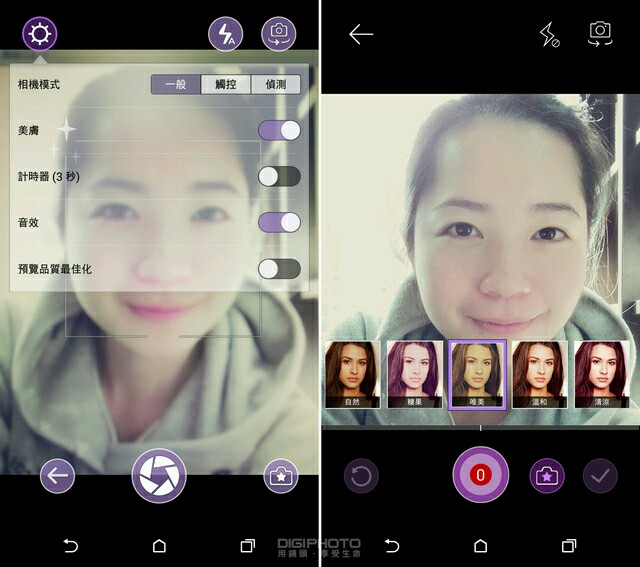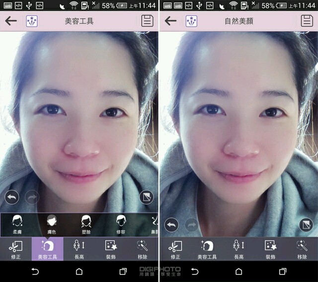 美图在自拍领域赫赫有名,修补美化功能也是一等一,人像美容从肤色到眼睛,再到身高,针对单一项目提供了更细微的进阶设定,像是手动点击脸部部位就能直接调校,缺点是技术不佳的话,表情容易显得不自然。若是对于自己的修脸功力没有信心,也可以从一键美颜内建的10种妆感挑选适合的,还有轻度、普通和极度3种程度设定,满足你的爱美需求。美图秀秀不仅适用于自拍,在万能相机中也为食物、风景、静物量身设计不少滤镜,并支援即时预览功能,拍摄前就先选定喜欢的滤镜效果吧!