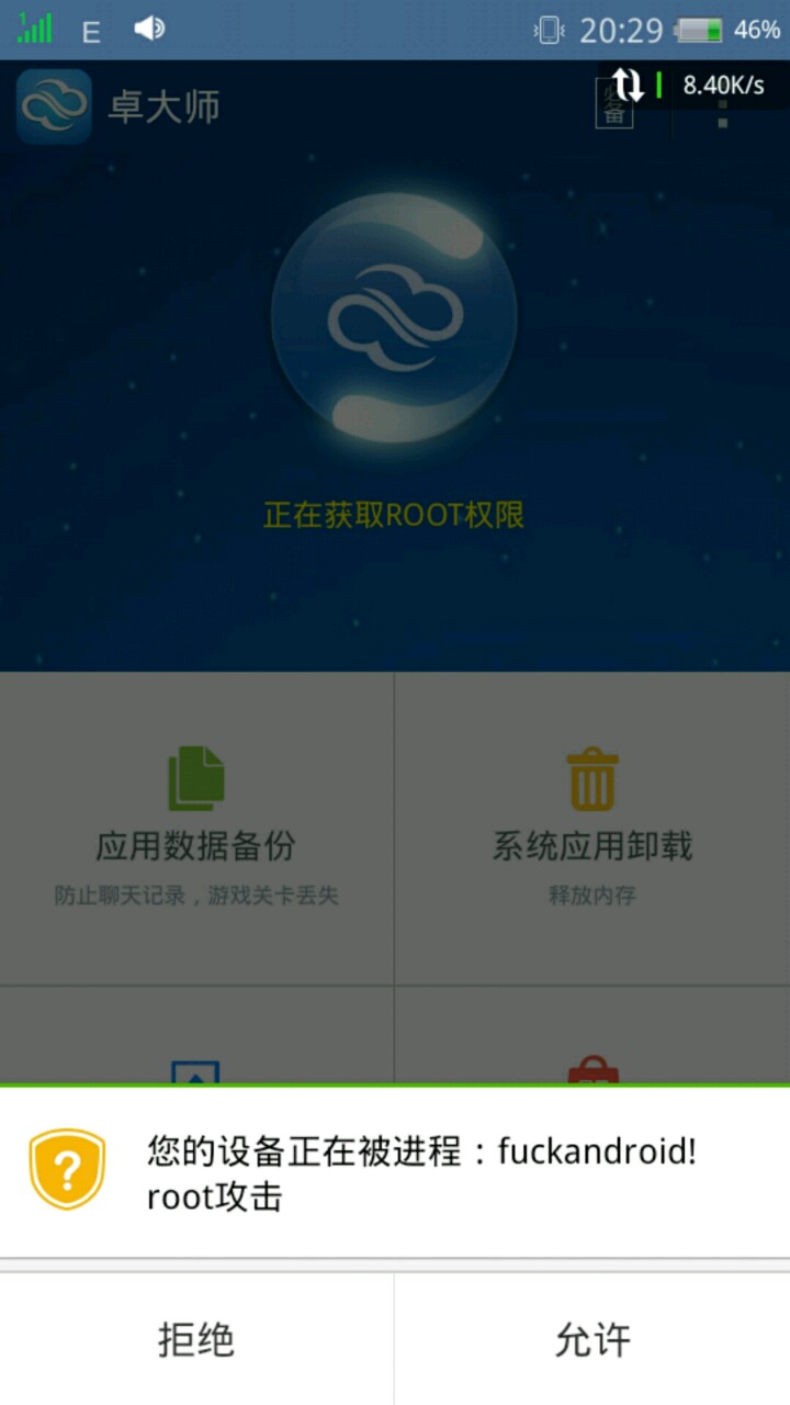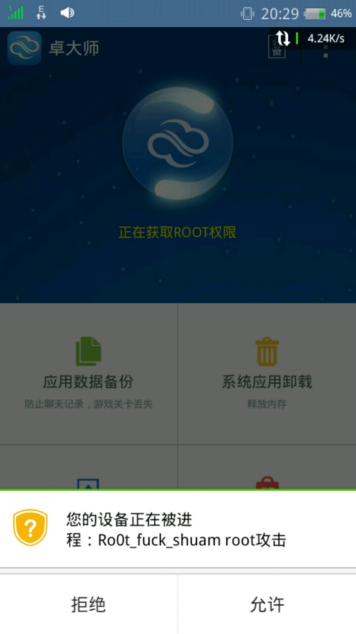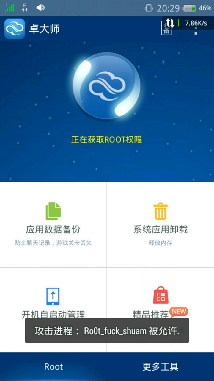 卓大师昨晚临睡前一键root可第二天早上打开却还是没有成功 今天试了可还是一样