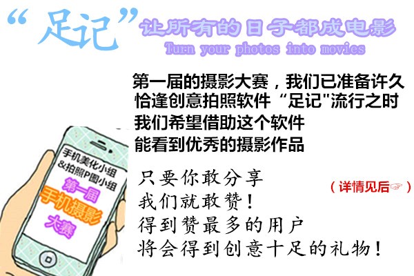 这次比赛除了要求用上“足记”app打造照片电影效果外,其他全无限制!你可以发挥你的创意,秀出你的文采!