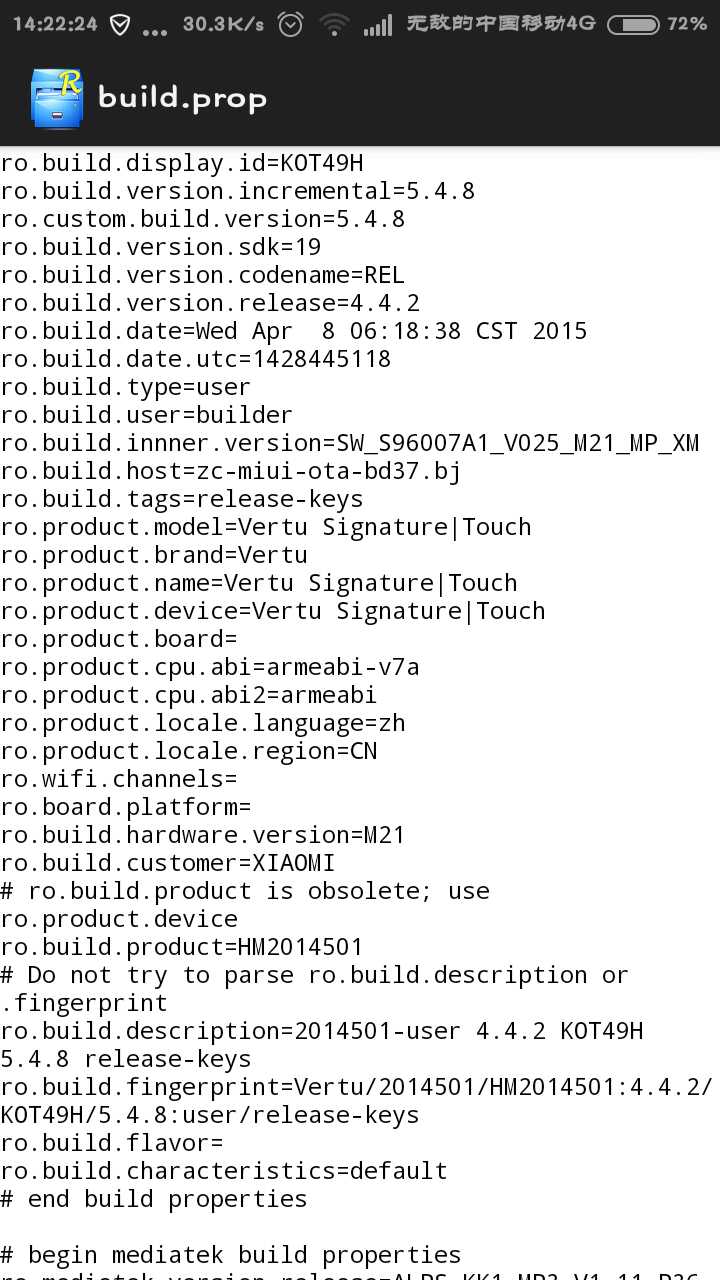 2,安装Root Explorer(RE管理器),依次进入根目录/system/build.prop,注意这时要长按文件名,不能直接进入