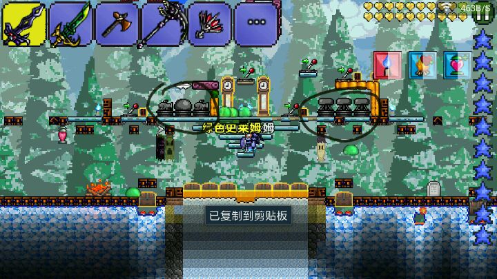 我们先设置出无限tnt,就是利用tr的一个特点,箱子下面的物块是无敌的,所以TNT会爆却不会消失。是一个bug。而设置出无限tnt后,就是促动无限tnt的时候了。相信很多人都习惯使用一秒延时促动器,不过对于无限tnt却不够,一秒对于无限tnt来说太慢了。所以有了第二幅图的蝙蝠促动加史莱姆促动。基本可以每秒促动十几次。反正算不清,大概就是那么多次吧。这种无限tnt极大程度的加快了刷boss的速度。以提高南瓜月总波数的目的。