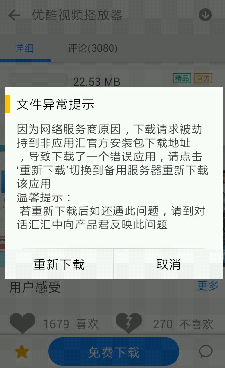 2、面对网络下载请求劫持,应用汇很郁闷,但又无能为力,应用汇也曾经找过天朝运营商解决,但均未遂,比较好的办法,就是以用户身份打运营商投诉电话,协调运营商给予解决;