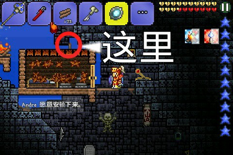 3,放一个火把,如图(用电线和机关连在一起)因为这个电路需要拉开操纵杆才可以工作,所以需要一个判断工作状态的东西。火把如果一闪一闪的,说明工作正常。如果一直亮或一直灭,就需要重新拉开操纵杆。