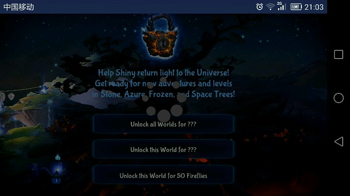 游戏玩起来很容易,如果还是不会玩没关系,汇汇中收录的版本是破解版(付费破解),可以无限使用提示。游戏界面非常绚丽,一款高大上的小型游戏,值得试玩。(截图中为关卡选择页面,仅仅从此处就可以看出游戏的绚丽啦)游戏使用物理的反射原理,只要点选发射口,用手指滑动屏幕(逆时针或顺时针滑动)就可以移动光束位置啦;点右上角萤火虫可以开启提示,提示的用法体验也算是不错的。【汇汇中现存版本为1.1.2,更新日期为2015.5.12。反映不能解锁第二大关的汇员,可以连接网络,点击弹出菜单的第一项是解锁所有关卡,第二项是解锁当前关卡,解锁过程会播放动画,必须看完它才可以(中途不可以断开手机连接)。】