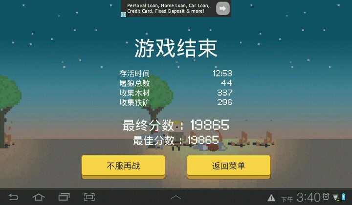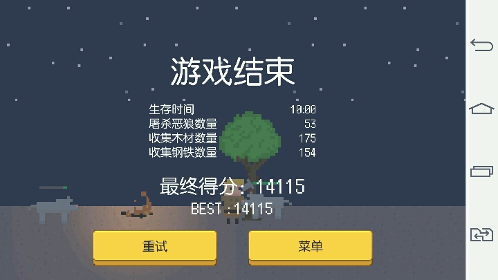 本人玩到八分多钟,实在撑不下去了... 游戏刚开始时是没有恶狼的,34秒差不多会出现第一只。恶狼没出现前先砍树挖石头...先升级剑,然后尽可能的在篝火旁放钉刺。随后升级生命! 多砍树,在石头和树多的地方放篝火,然后升级斧头和锄头,加快获取资源的速度... 然后就开始放墙壁了...注意!因为墙也会阻挡自己的活动,所以墙的位置一定要选好。我玩到后面时,就因为两面都放了墙,结果中间的资源没了..... 墙壁的前面可以放钉刺,给恶狼造成多重伤害。 这是一款不错的游戏,希望大家能玩的开心!
