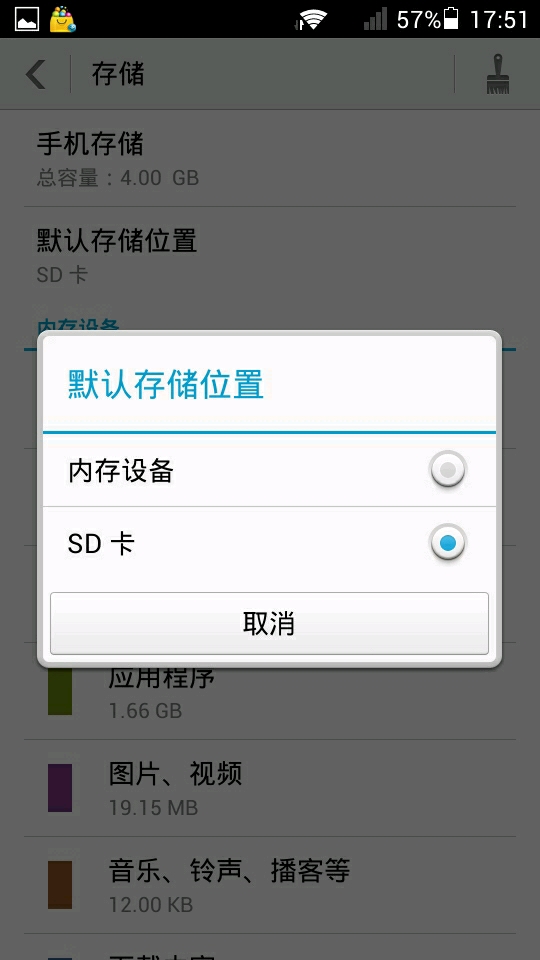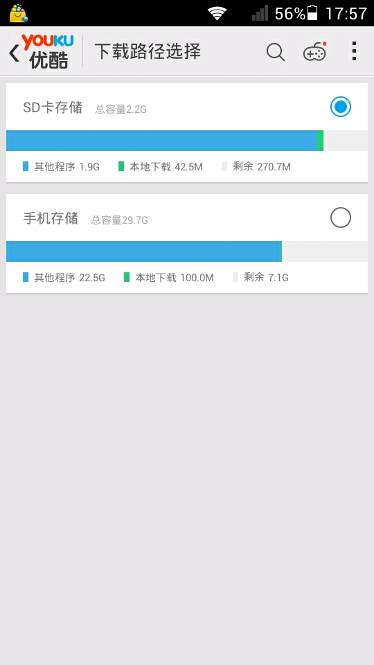 如图,在没修改默认储存位置时,我原本在优酷设置的默认储存位置是sd卡,如今选项已经对调了。
