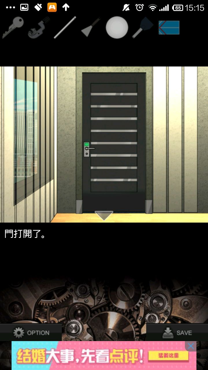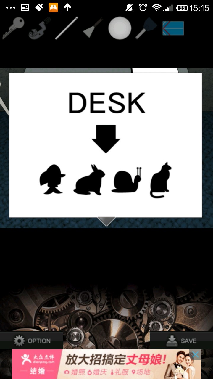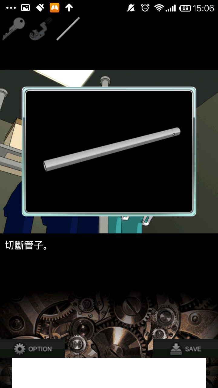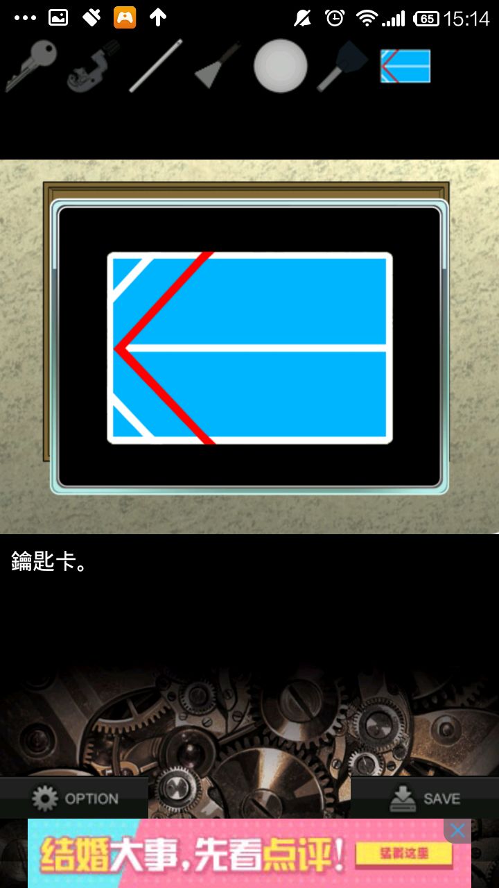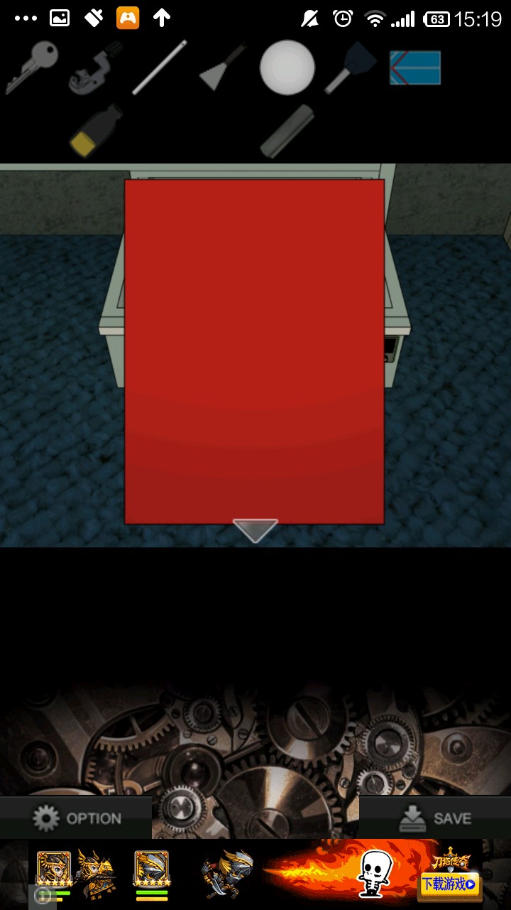 右转,点灰色柜子,检查右侧柜壁提示.根据提示,按"左上,中,右下,右上,左下"的顺序打开抽屉,得到钥匙.用钥匙打开中上抽屉,得切管机.