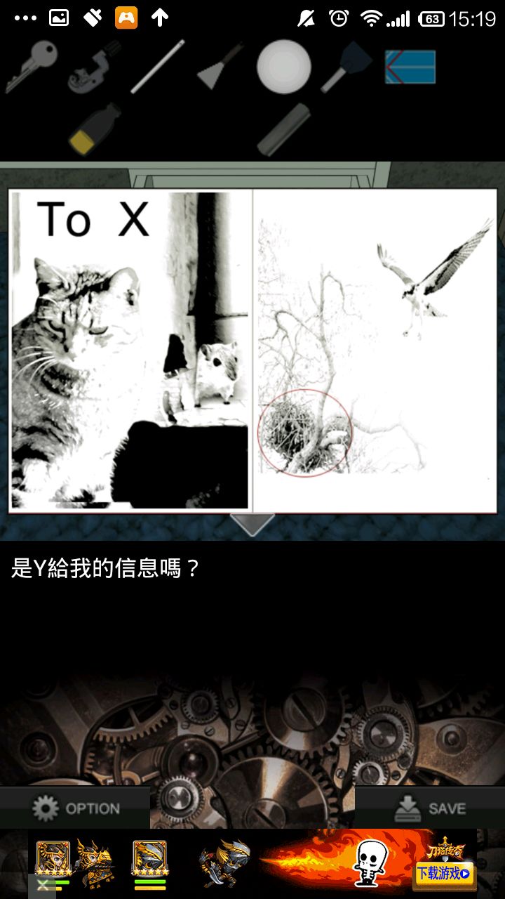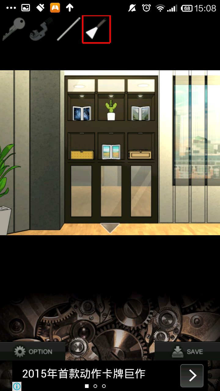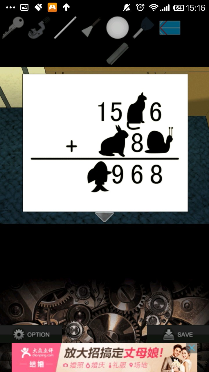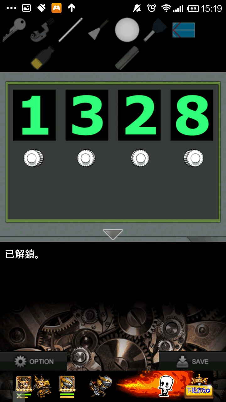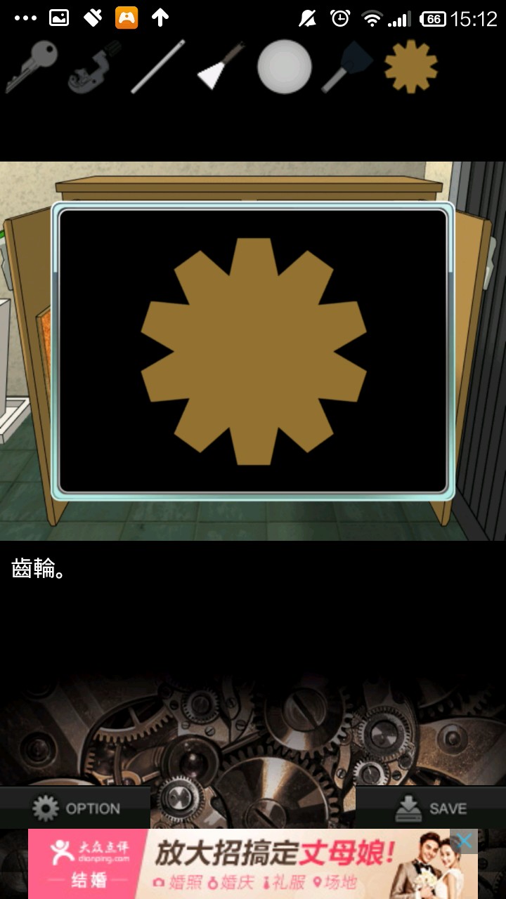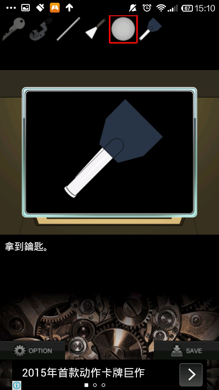 右转,点灰色柜子,检查右侧柜壁提示.根据提示,按"左上,中,右下,右上,左下"的顺序打开抽屉,得到钥匙.用钥匙打开中上抽屉,得切管机.