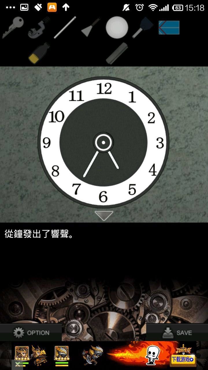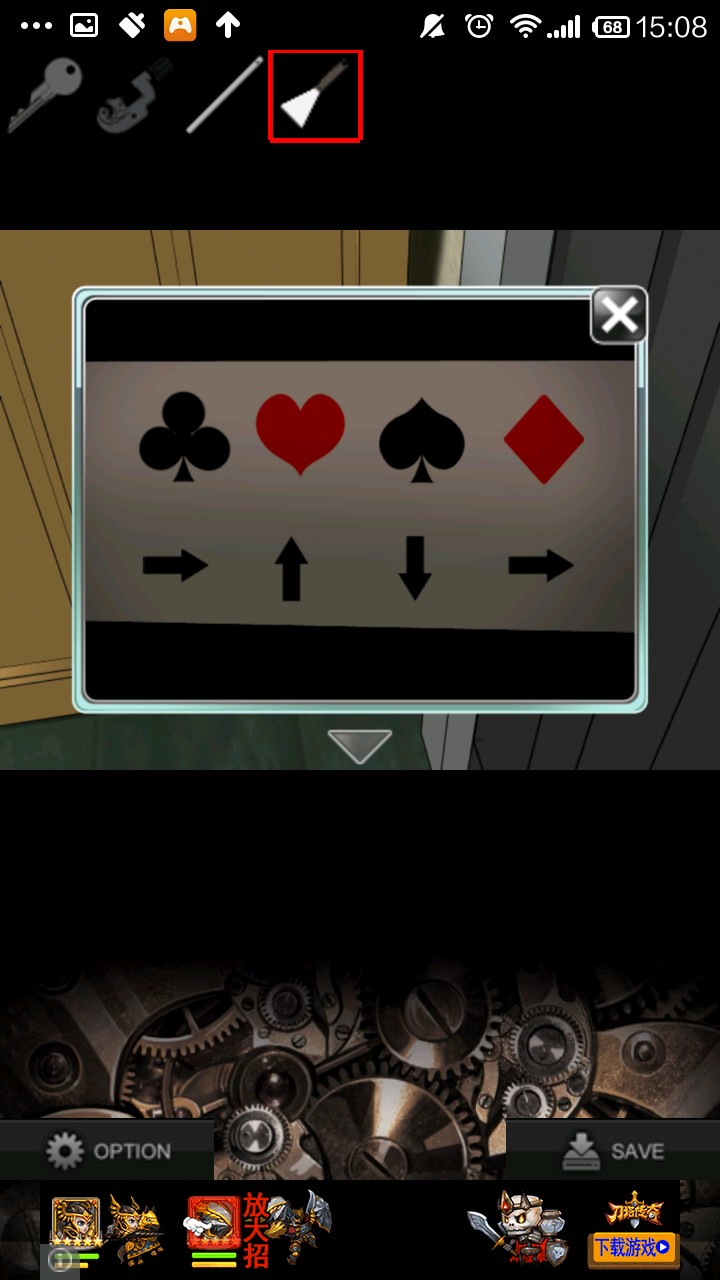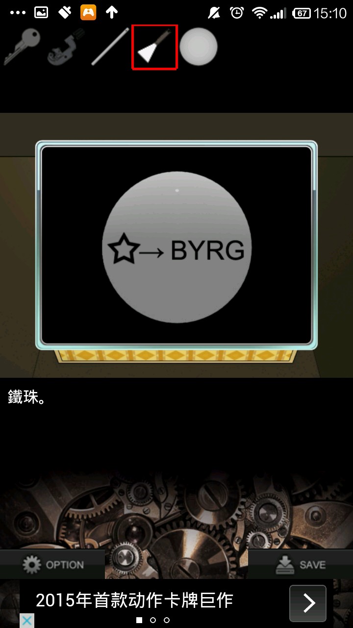 右转两次,点展览柜,点左侧黄色箱子.根据提示,"梅花点一下,黑桃点两下,方块点一下",箱子打开得铁珠.检查铁珠,看提示.