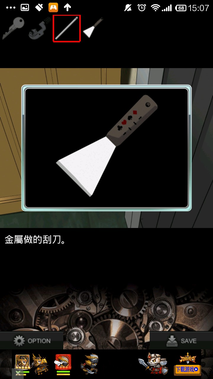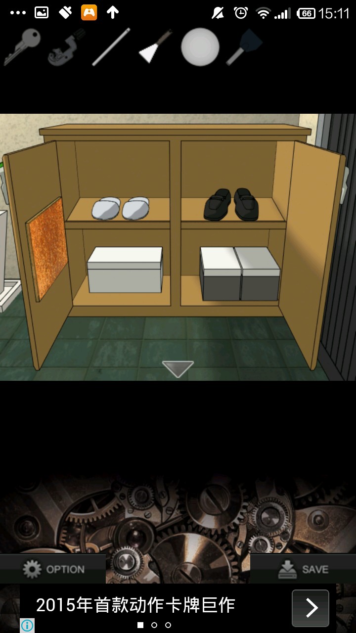 左转,进入衣帽间,用切管机把右上的管子切下来,得铁管.返回,点大门,点鞋柜.对着右侧空隙使用铁管,得刮刀.检查刮刀,看提示.