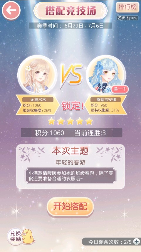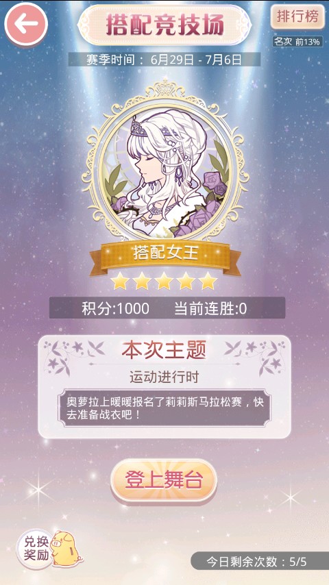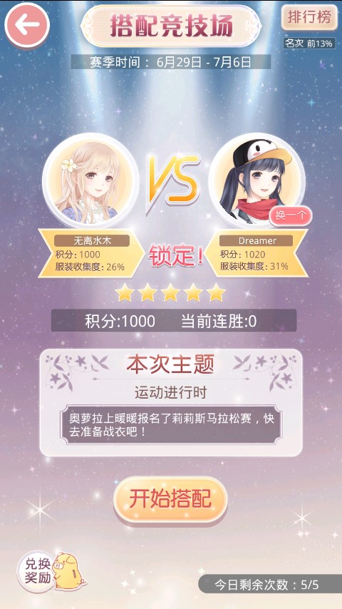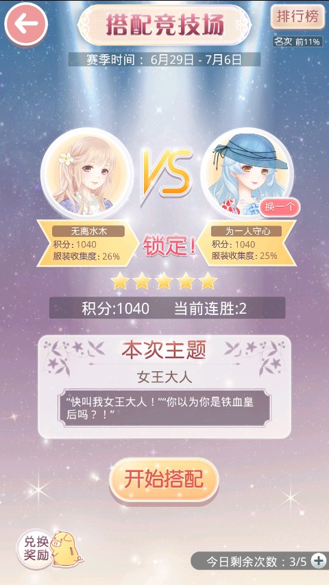 每个赛季都要撸到搭配女王5星 因为有最高奖励(≧▽≦)/ 然而进不了排名TAT每天清日常即可,首先找对手,这里提醒一下,看到服装收集百分之多少不用慌,看头像判断对手的套装,如果对手衣服你有,那么最好穿成一样的,在根据任务提示搭配部件,当然如果你有把握搭配能赢那就穿自己的