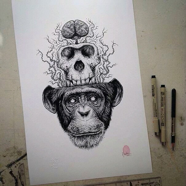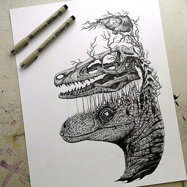 好啦~那我们继续吧~真是抱歉啊~一位住在加拿大多伦多的艺术家Paul Jackson利用签字笔和铅笔画了一系列相当别致的作品。他不仅将各类动物的模样刻画得惟妙惟肖,更特别的是他在动物身上添加了骨骼或内脏~啊,不知道大家看到这样另类的作品感想如何~小七是觉得还不错~