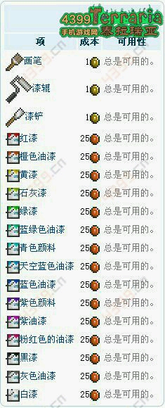 NPC名称 染料商人入住条件 当你获得染料或任何物品用于制造染料的物品后会入住NPC作用 销售一些与染料有关的工作台