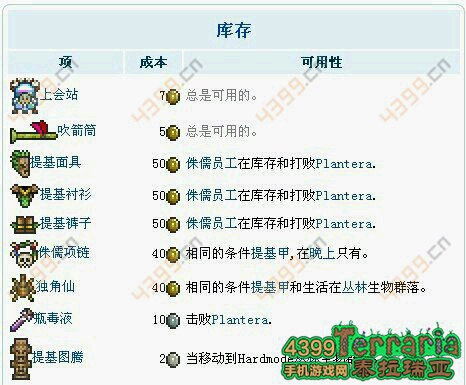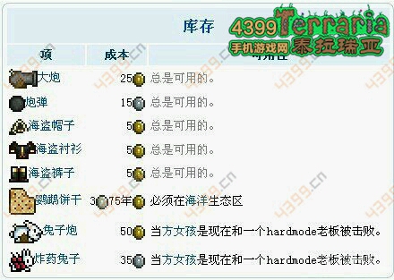 NPC名称 海盗入住条件 击退一波海盗入侵后入住(海盗入侵的书怪物都会掉落)NPC作用 出售服装,炮弹和弹药