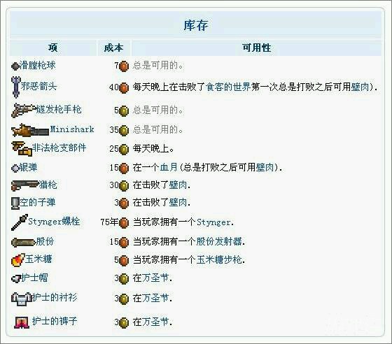 NPC名称 军火商入住条件 随身携带枪械与弹药(放箱子无效、空间枪、魔法激光枪无效)NPC作用 售卖一系列枪械及子弹吗,特殊时间还有专门的枪