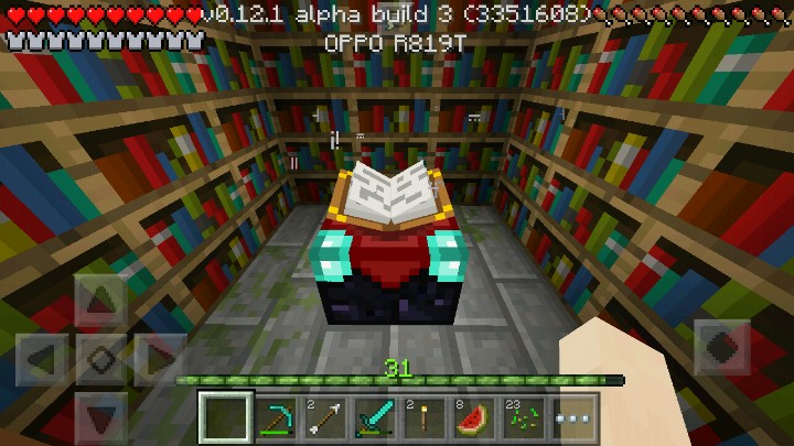 自minecraft pe出了0.12.1,众多玩家欣喜若狂,在这个版本里添加了很多物品甚至是把地狱和附魔也带到了pe里。回归正题,附魔是靠几率的,lz也有时附不到好的属性,要想要好属性,首先得必须把附魔台进行升级。lz的方法需要12个书架,献上图片