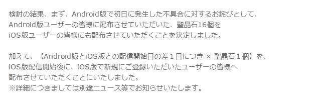 《Fate/Grand Order》的制作人庄司显仁对于安卓版上线后第一天服务器就长时间维护,对玩家表示抱歉,同时决定向安卓版和未来 iOS 版游戏玩家每人赠送 16 个圣灵石,圣灵石在这款游戏中是可以用来抽卡的,平时要做任务或者氪金才能获得。同时对于 iOS 版迟迟没有上线,这位制作人出了个狠招,只要 iOS 版上线时间比安卓版晚一天,未来 iOS 版玩家就可以多获得一个圣灵石,而至于 iOS 版何时上线这位制作人依旧没有给出具体说明,同时对于抽卡掉率以及道具和角色混抽的问题,也没有做出任何说明,不过看上去 iOS 版的玩家占了一个大便宜啊,要是万一 iOS 版延期一个月呢?那可就是 30 个圣灵石 ~不过我不玩所以并没有什么卵用~