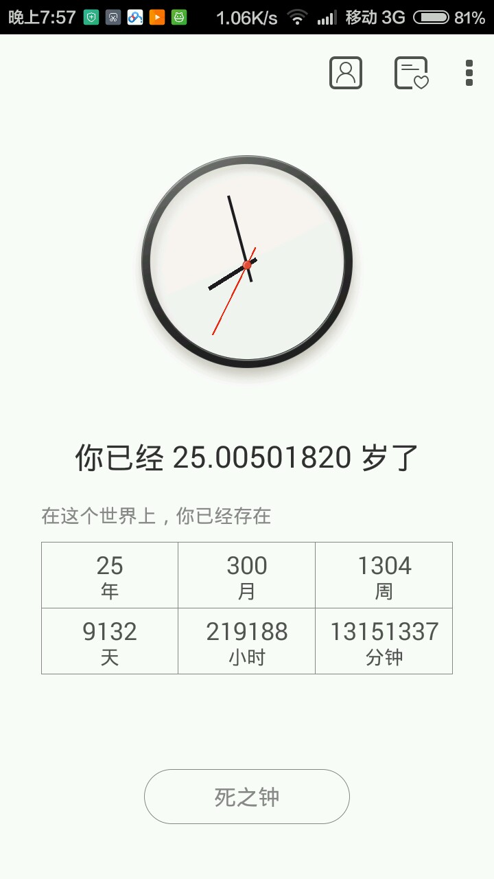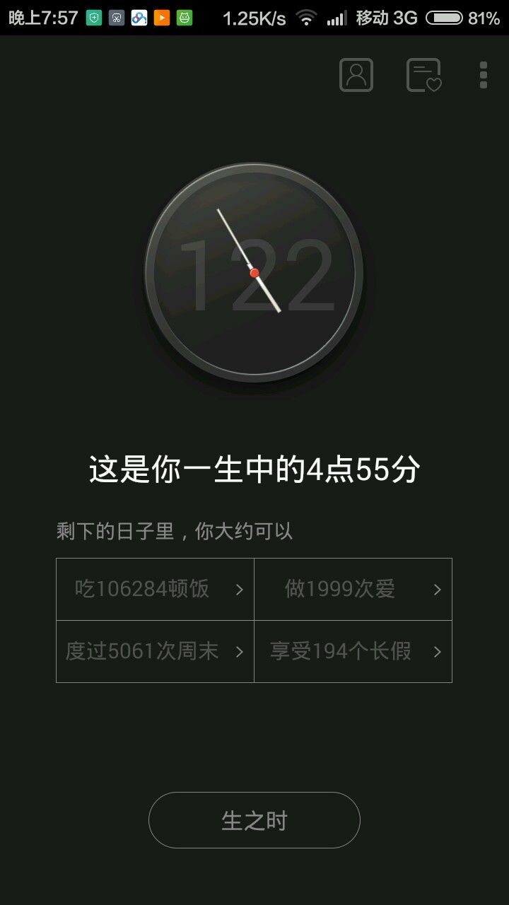 很好,设定完出生日期后,出现的生之时详细地记载你从出生到现在的时间(年,月,周,天,小时,分钟),让人感慨道原来我也不年轻了,该珍惜时间,好好学习,努力上班了。每一岁都是时针的一圈。再就是死之钟把你预计的年龄同样呈现在钟盘上,时针转完一圈,你就“死了”。也让人有该珍惜时间的感觉,还有心愿,看一下往日你想做的事情,曾经的愿望你实现了吗?是否该努力了呢?还有它的简洁风,黑与白,生与死,让我一看就爱。总体上说,我认为真的很不错,值得你下载。
