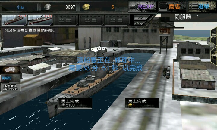 游戏分为剧情,教程,对战三个模式[小Ki并不推荐一级就进入对战]之后在你撸了几局后[战舰如果受损严重会右维修时间,可以用金币/银币进行立即维修完毕]。