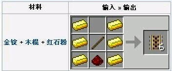 红石铁轨,又称充能铁轨,可以被周围的红石信号激活,从而加速矿车,最多能够送出80格铁轨的距离附图红石铁轨和配方