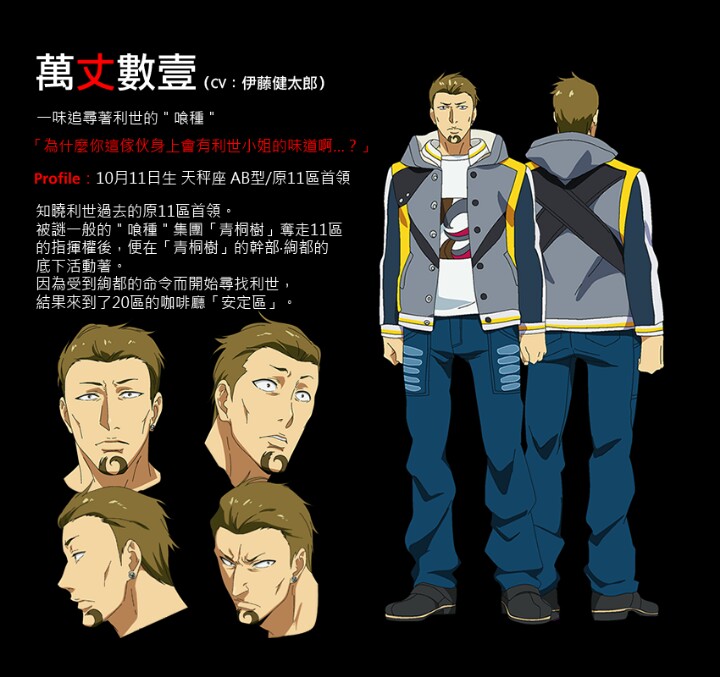 2:高摫泉 绰号:独眼之王(SSS级啃种,与其他啃种不同,拥有独眼,混血儿的优势,所以比芳村功善还要强大,实为青铜树组织的首领,平时以干部艾特的身份行动,有着高槻泉、艾特和独眼的枭的多种身份。)