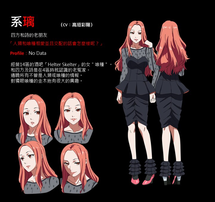8:神代利世 绰号:暴食狂 (拥有紫色长发,身材高挑,长相可爱,是SS级的强大的食尸鬼,被CCG称为大啃,从不追求地位)