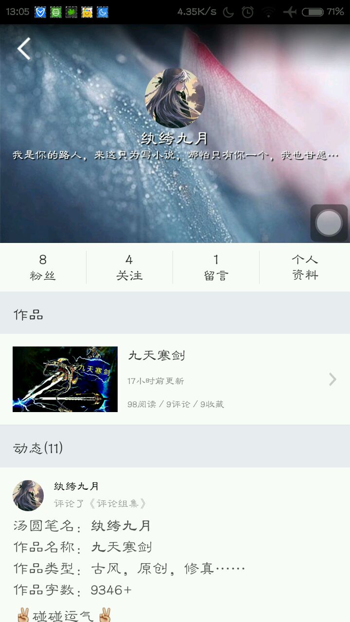 首先,他的界面很美,对于那些喜欢写小说的女孩纸是很适合的ヽ(ー_ー )ノ,再其次的是它的社区功能,里面的活动和句子都是美美哒,这点我是尤其喜欢的,非常适合写小说的人们交流,也算是心灵鸡汤了◑﹏◐糟糕,穷词。