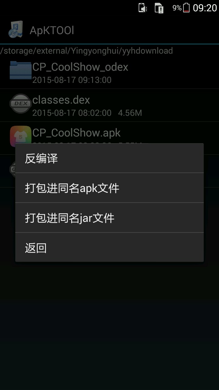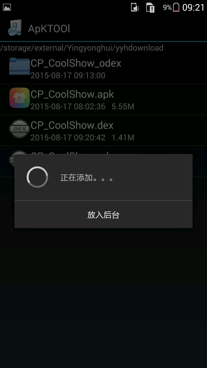 今天小帅为大家带来合并odex文件的方法,减少占用空间,低内存手机党(内置130MB左右)的福利!这里以 Coolshow(我的手机桌面美化软件) 为例1.获取ROOT权限(没权限搞什么机?!)2.安装APKTOOL,汇汇里有这个软件(搜索apk反编译)3.使用可读取系统文件的浏览器,进入System→App,选取任意软件和对应的odex文件,复制到空文件夹。(这里就不发图了)4.进入APKTOOL,找到那个文件夹,点击那个软件,弹出菜单栏,点击反编译全部,耐心等待,如图1。5.反编译完成后,会出现一个文件夹,点击这个文件夹→编译,如图2。6.编译完成后,这时出现dex格式的文件,点击→打包进同名文件,如图3。 等待几秒,搞定!如图4。7.这时候需要验证这个软件是否能用,使用re浏览器,找到这个已合并的软件→点击查看,看看里面是不是有classes.dex这个文件,有的话就是成功,没有的话就是失败。(一般不会)7.使用re浏览器,复制已合并的软件到System,覆盖原文件,再删除原odex文件,重启手机,进入合并过的那个软件,看看是否能运行,再进入re查看,软件的体积是不是变小了?再合并几个,就可以多装一个软件啦