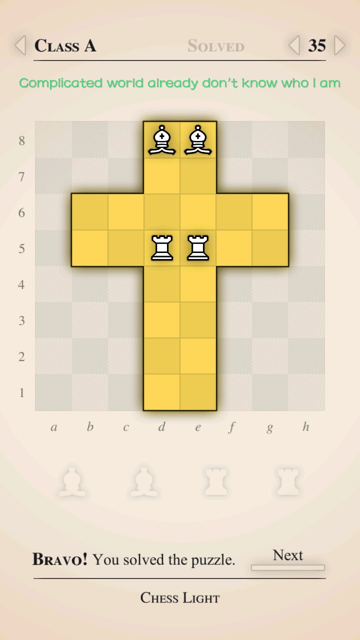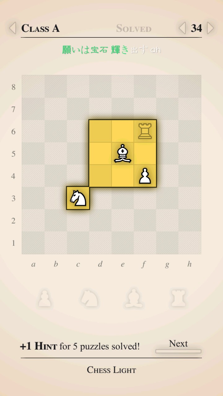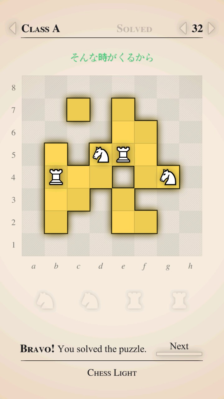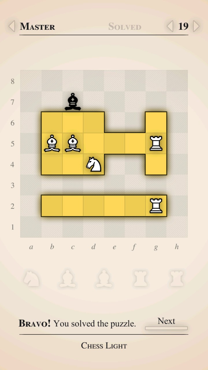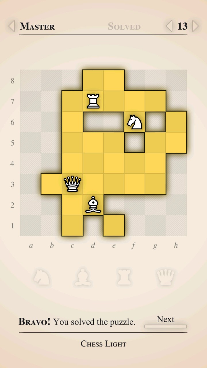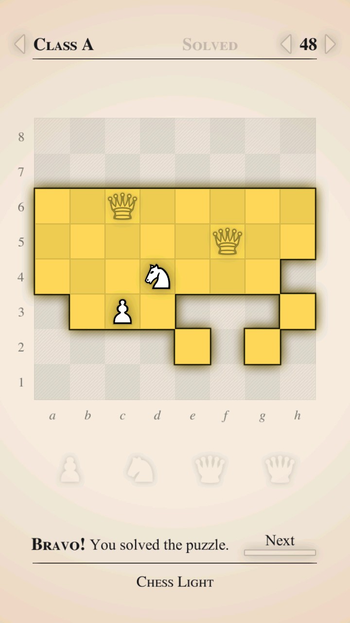 我们需要根据国际象棋的走棋规则,将给的棋子放到棋盘上,该棋子能走到的区域会被点亮为黄色,不过其自身所处的位置无法点亮~利用给定的棋子将所有棋盘点亮就可以过关了~