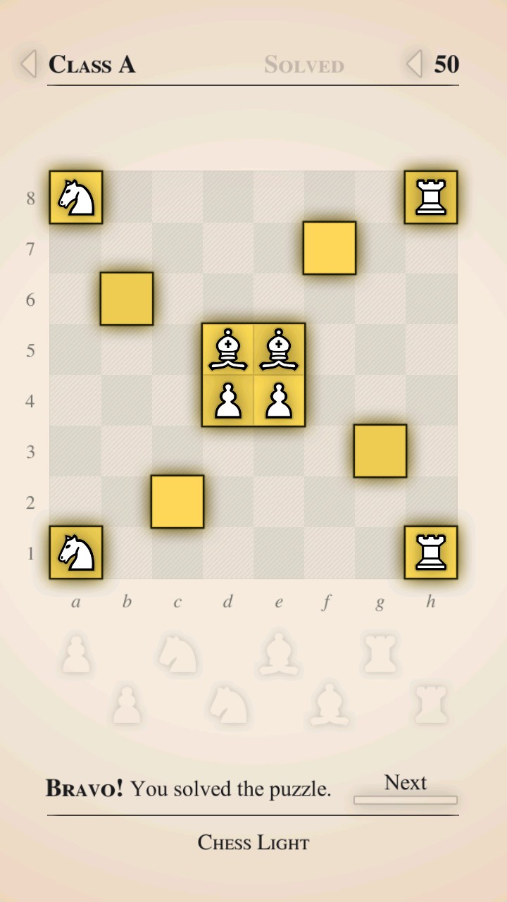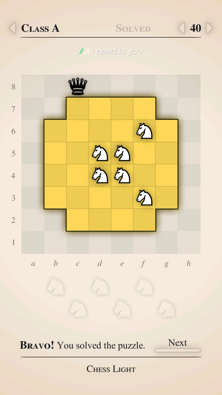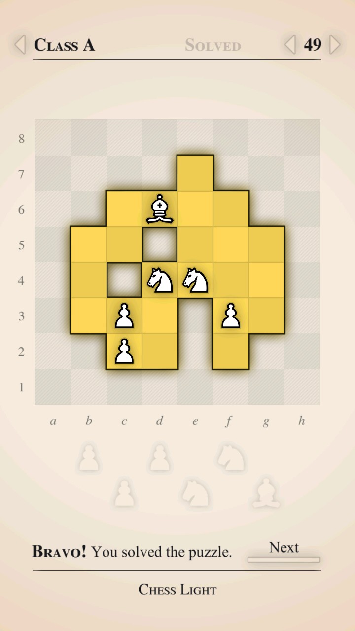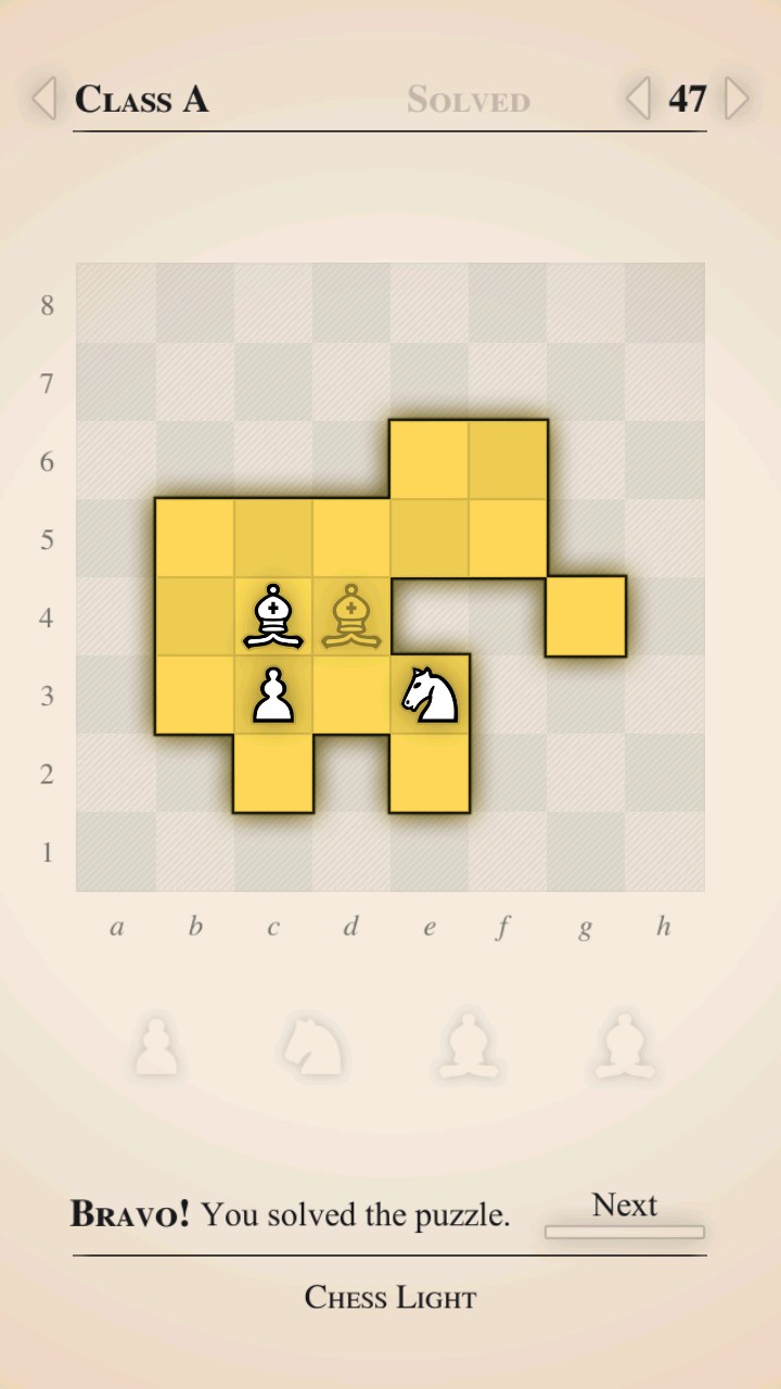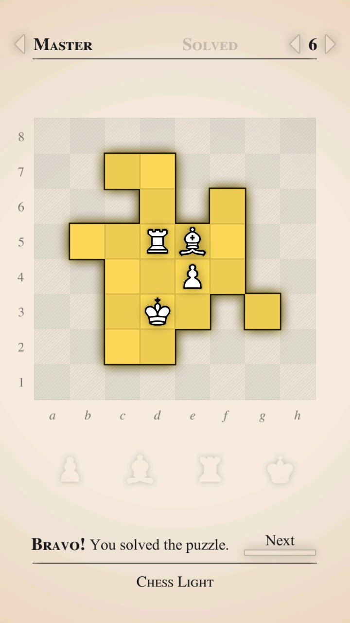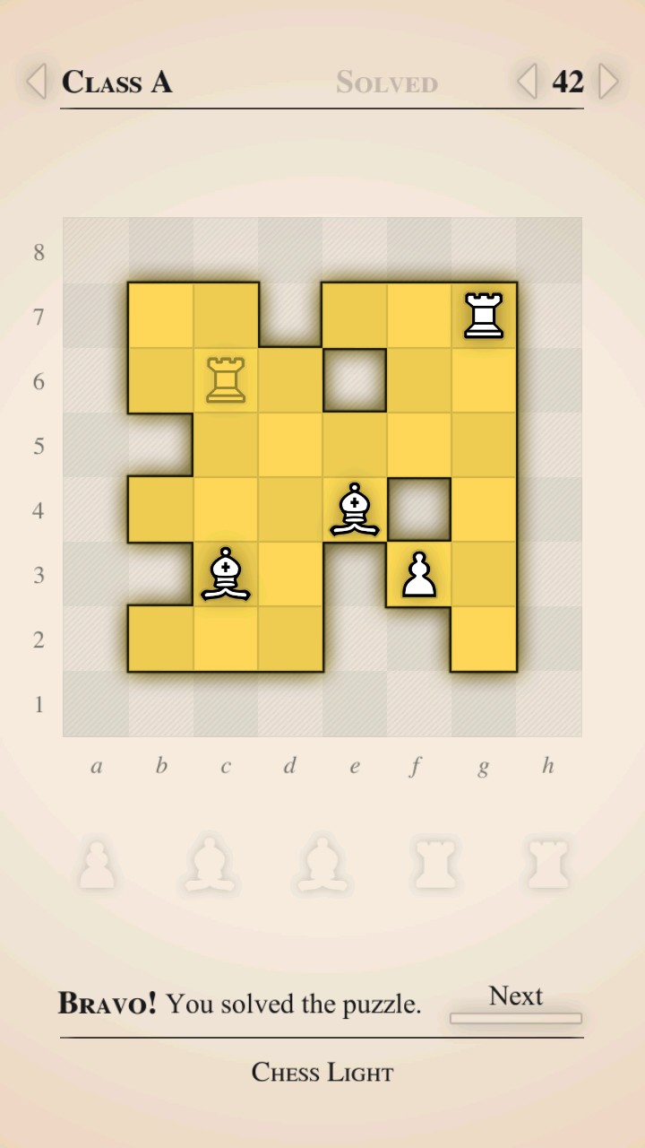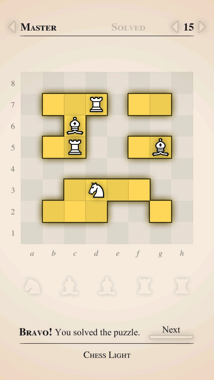 我们需要根据国际象棋的走棋规则,将给的棋子放到棋盘上,该棋子能走到的区域会被点亮为黄色,不过其自身所处的位置无法点亮~利用给定的棋子将所有棋盘点亮就可以过关了~