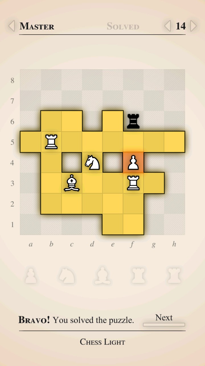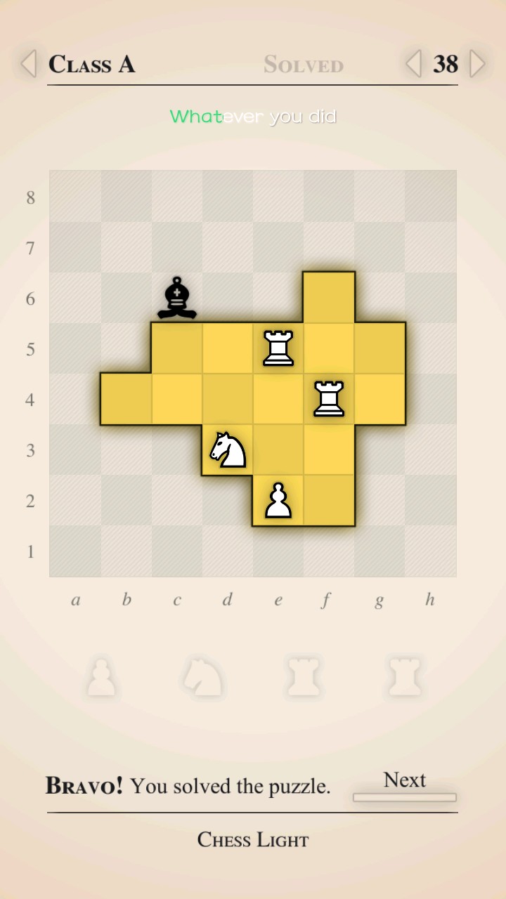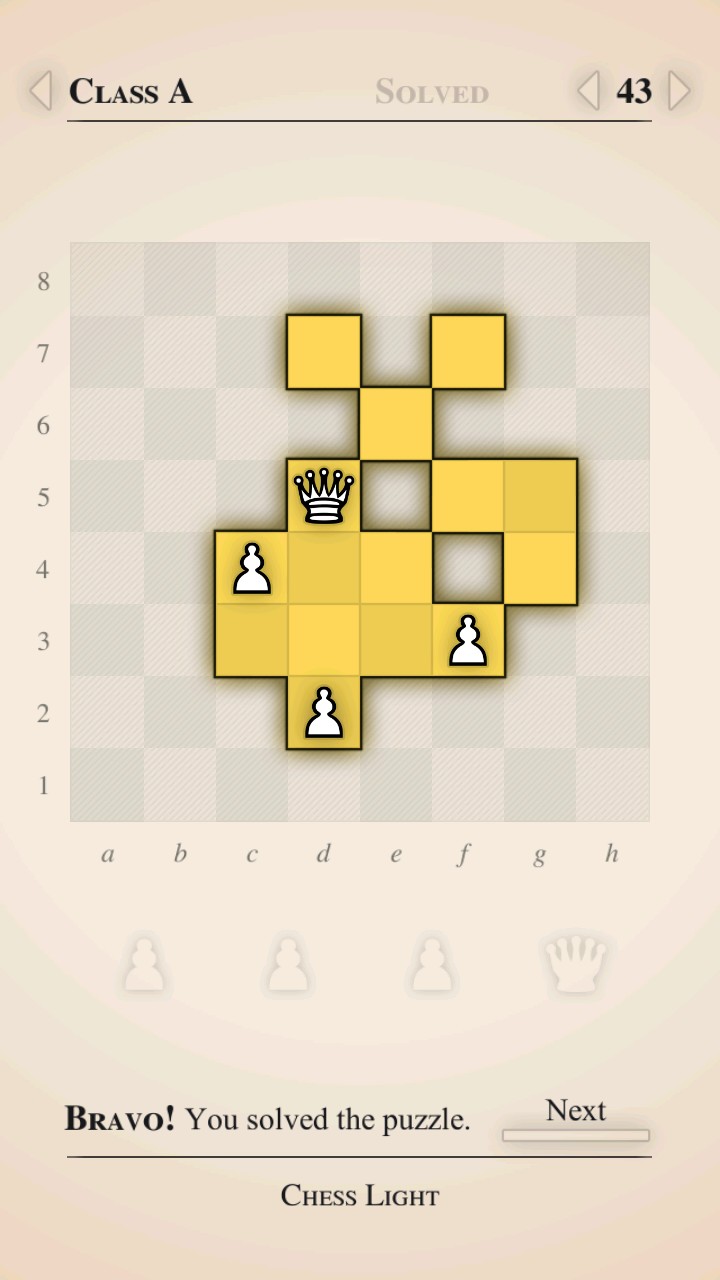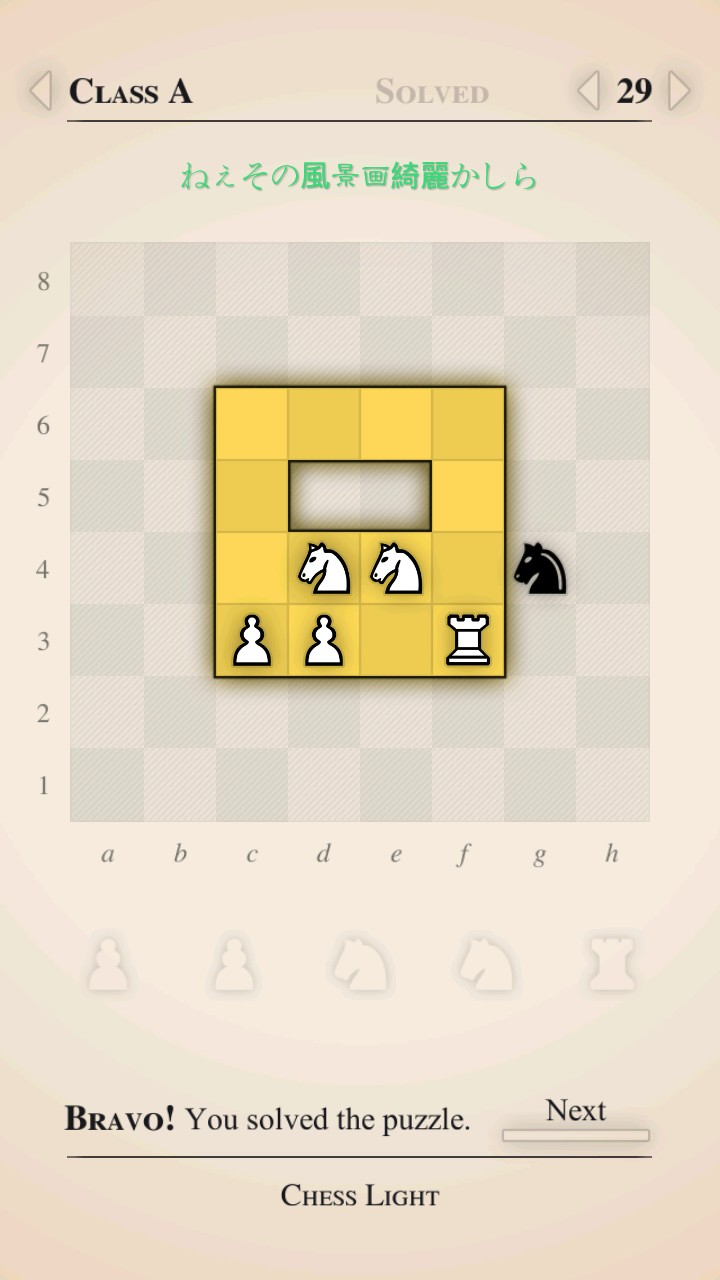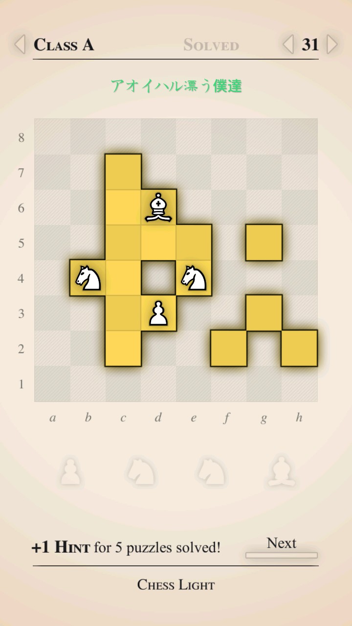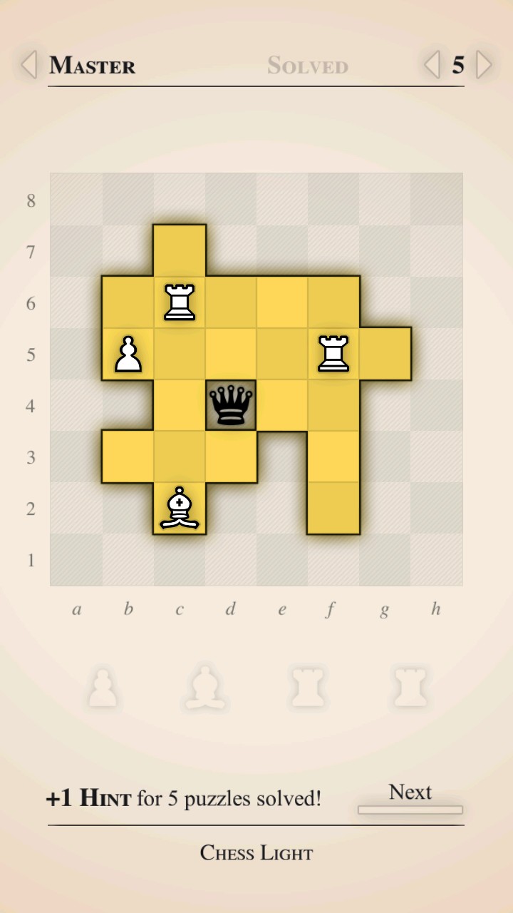 我们需要根据国际象棋的走棋规则,将给的棋子放到棋盘上,该棋子能走到的区域会被点亮为黄色,不过其自身所处的位置无法点亮~利用给定的棋子将所有棋盘点亮就可以过关了~