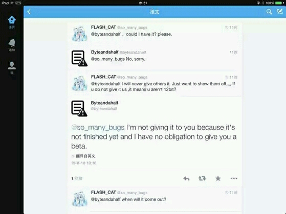 【很多人向我要蓝链#(滑稽) #(茶杯) 】推友:“我可以有一个那个插件吗?#(乖) ”12Bit:“不行,对不起。”推友:“我绝不会给别人的。(盆子:呵呵)我只是想炫耀一下,如果你不把它给我,你就不是12Bit!”(我如果12Bit我就糊她熊脸)12bit:“我没有给你是因为他还没有完全完成,况且我没有义务给你一个测试版。#(阴险) ”(12Bit脾气真好.....)推友:“啥时候发布?”(你还敢问!#(啊?) )12Bit:“差不多等12.1出来#(阴险) ”推友:我实在是需要它尽管它没有完成或其他原因,我就是在我上学之前要他!我英语不好!(你难不成是某虾派来的db?#(阴险) )推友:好吧。谢了。(故事有些奇怪,那个推友为什么会说“谢了”,难不成12Bit给他了?......欲知后事如何,请听下集分解)