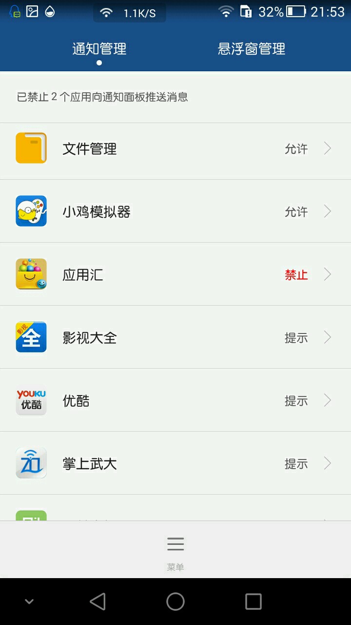 在有管理应用权限功能的APP里禁止汇汇在通知栏显示如图(我的是自带手机管家,好像lbe 有这个)
